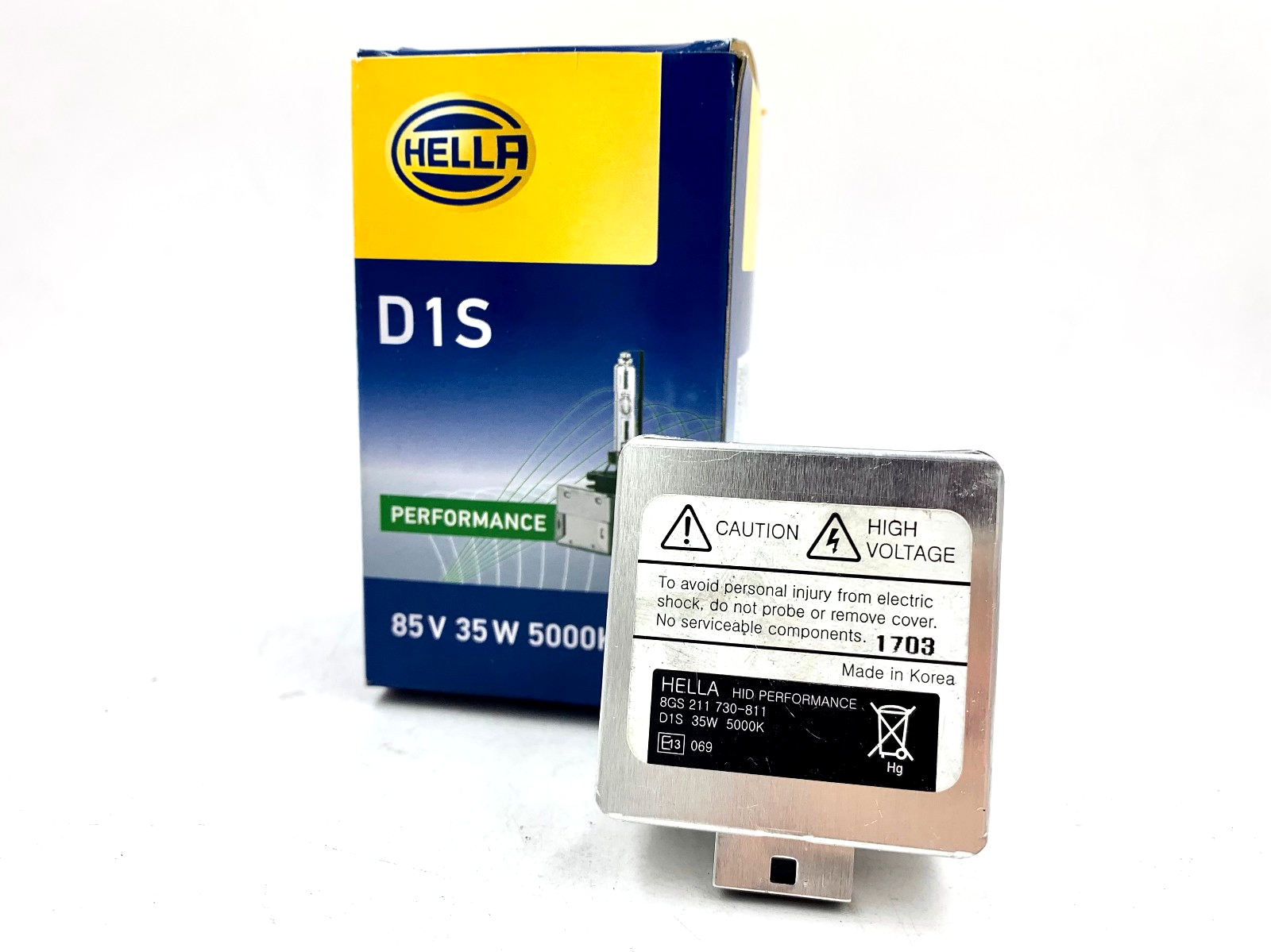 One (1) brand new original OEM Hella D1S 5000K xenon H.I.D headlight bulb with built in igniter
